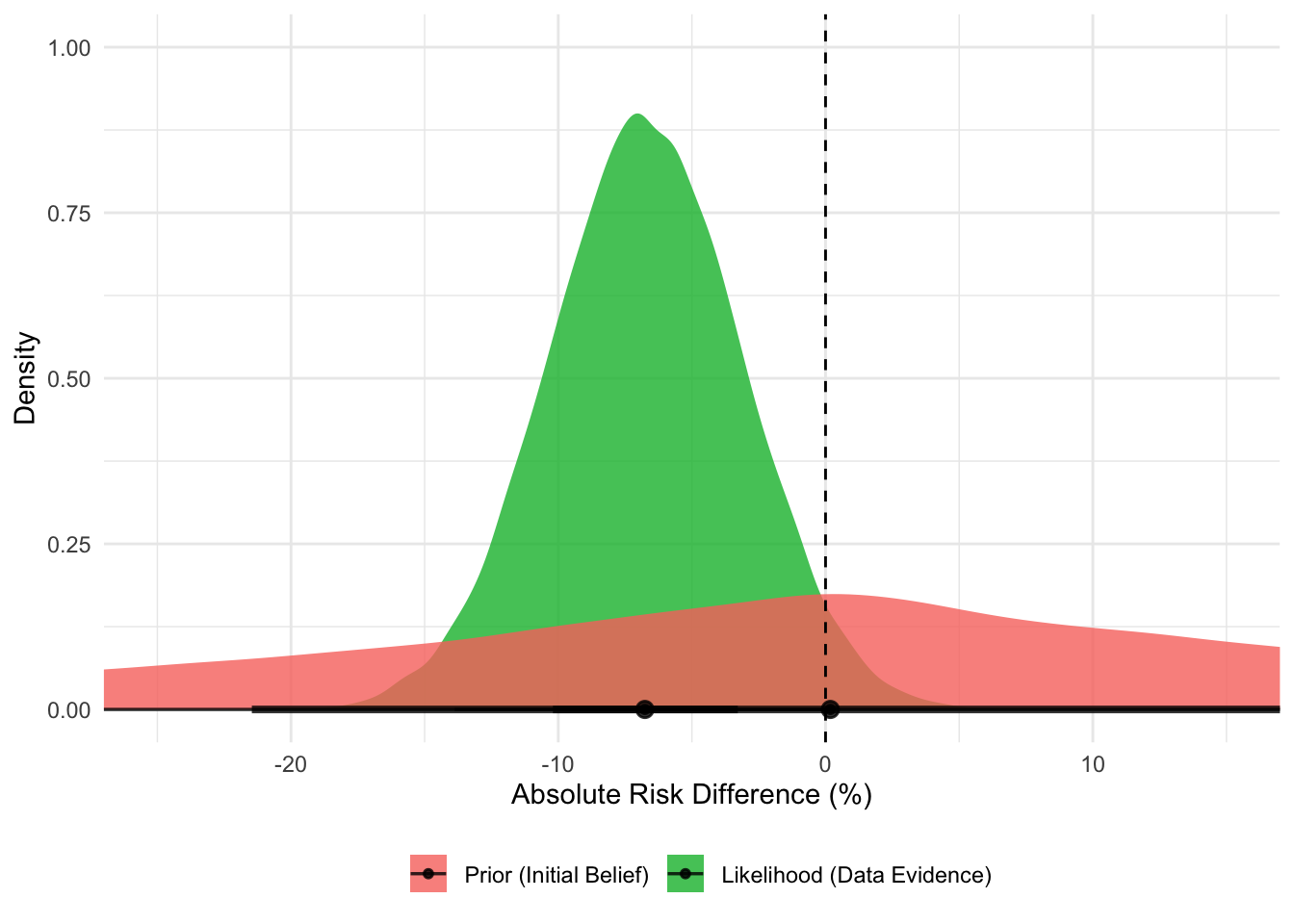 The Prior (red distribution) is our initial belief. It’s centered on a risk difference of zero (no effect) but is very wide, indicating that we are uncertain and believe a wide range of effects (both beneficial and harmful) are possible before seeing any data.