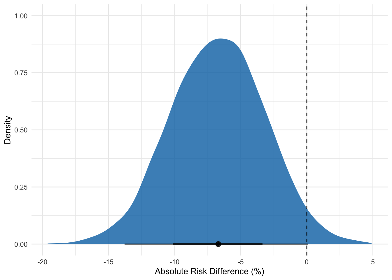 The Bayesian approach is to instead estimate the probability of benefit. We can ask a more practical question: “What’s the probability that the treatment is beneficial (i.e. that the risk difference is less than zero)?” using the model: