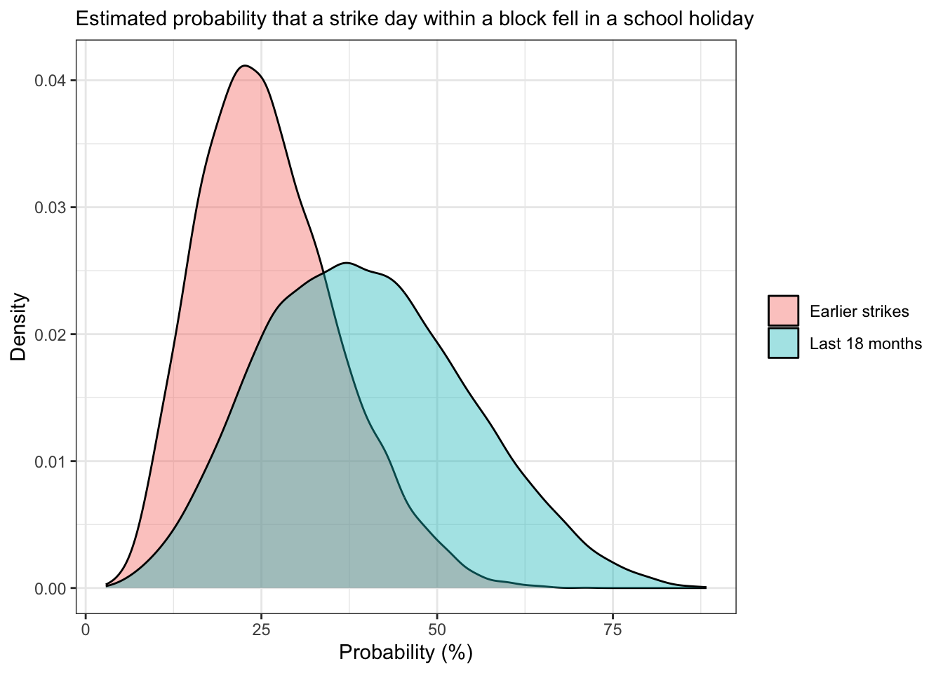}The estimated probability that a strike day within a block fell in a school holiday was 26.1% for earlier strikes (95% credible interval 10 to 48.2%) and 39.8% for the last 18 months (14.2 to 69.4). We can show this graphically: